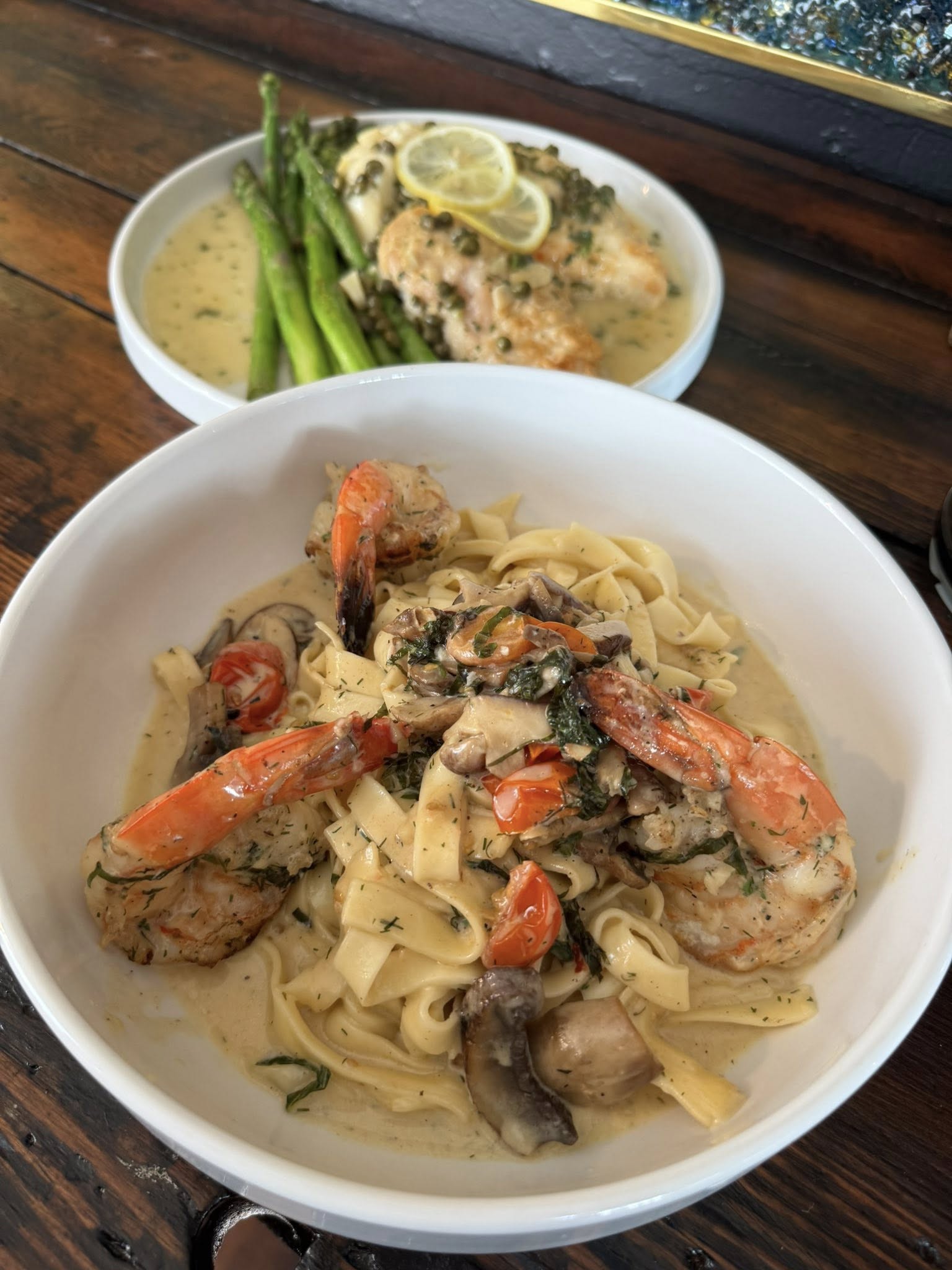 fettuccine sautéed shrimp, shiitake, cremini + sun-dried tomatoes in a light garlic, white wine + dill sauce