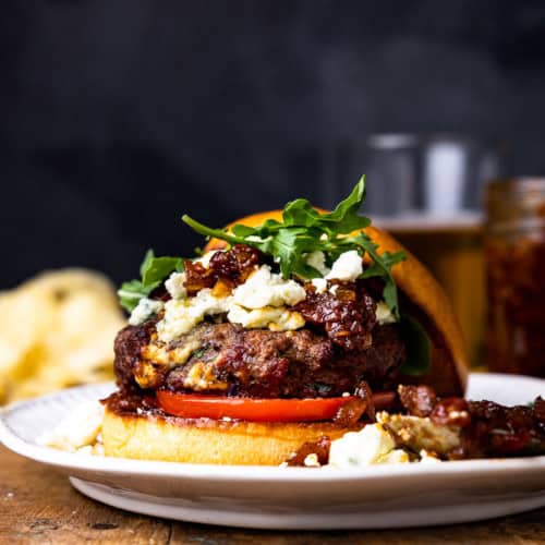 Greco-Italian hot sausage, topped with tricolor bell peppers, garlic