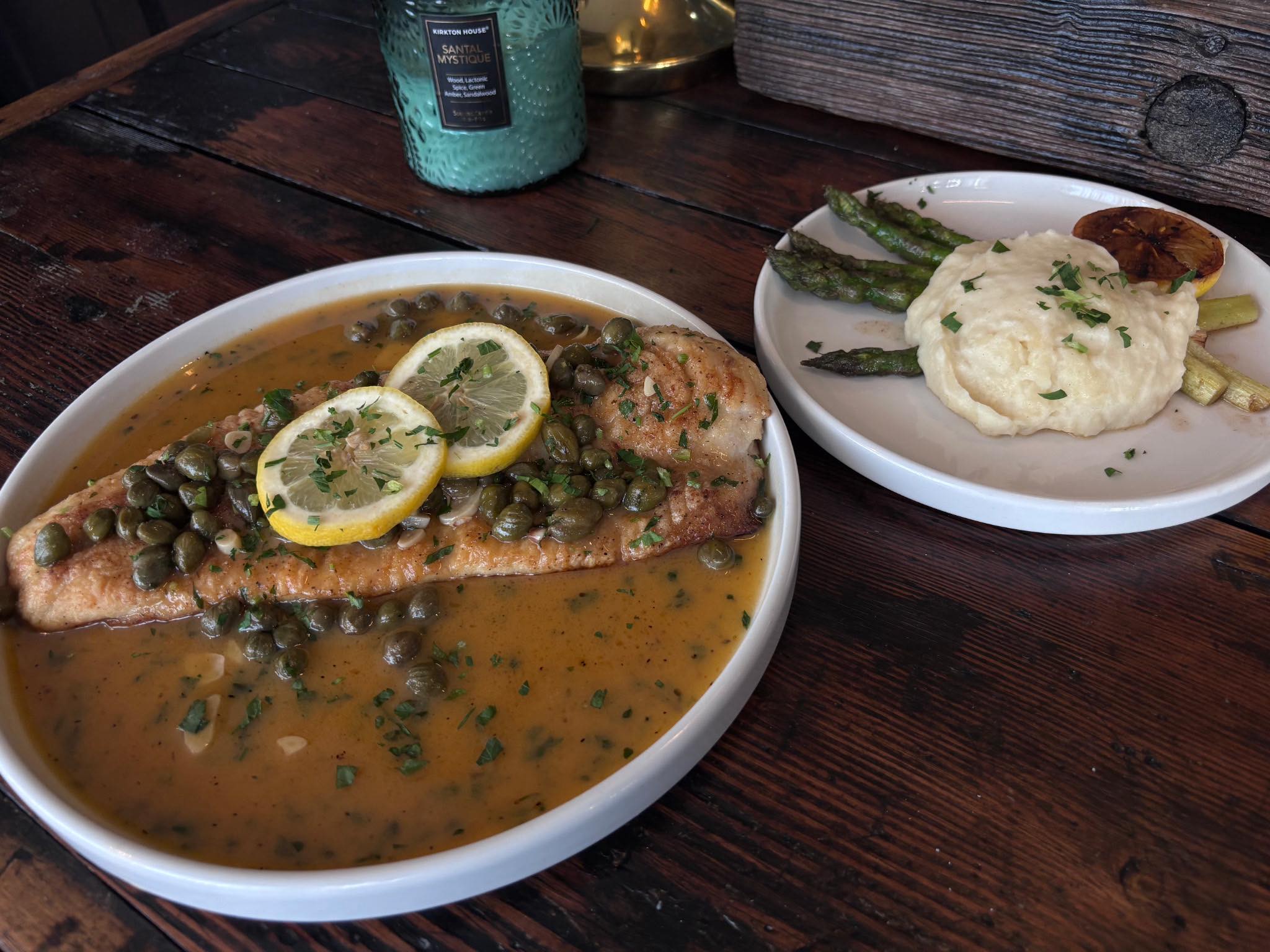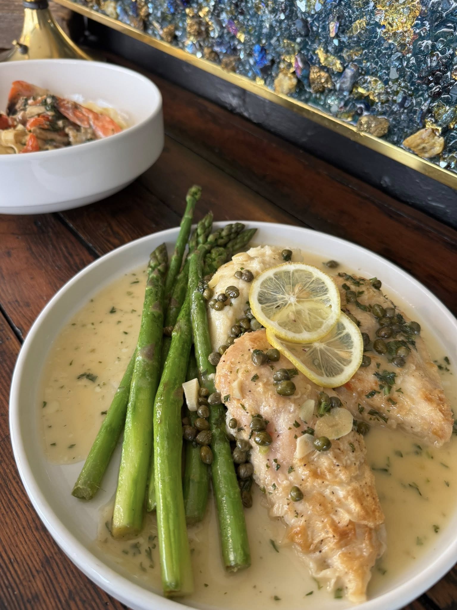 12oz lightly-floured chicken, traditional garlic white whine sauce, lemon juice, capers