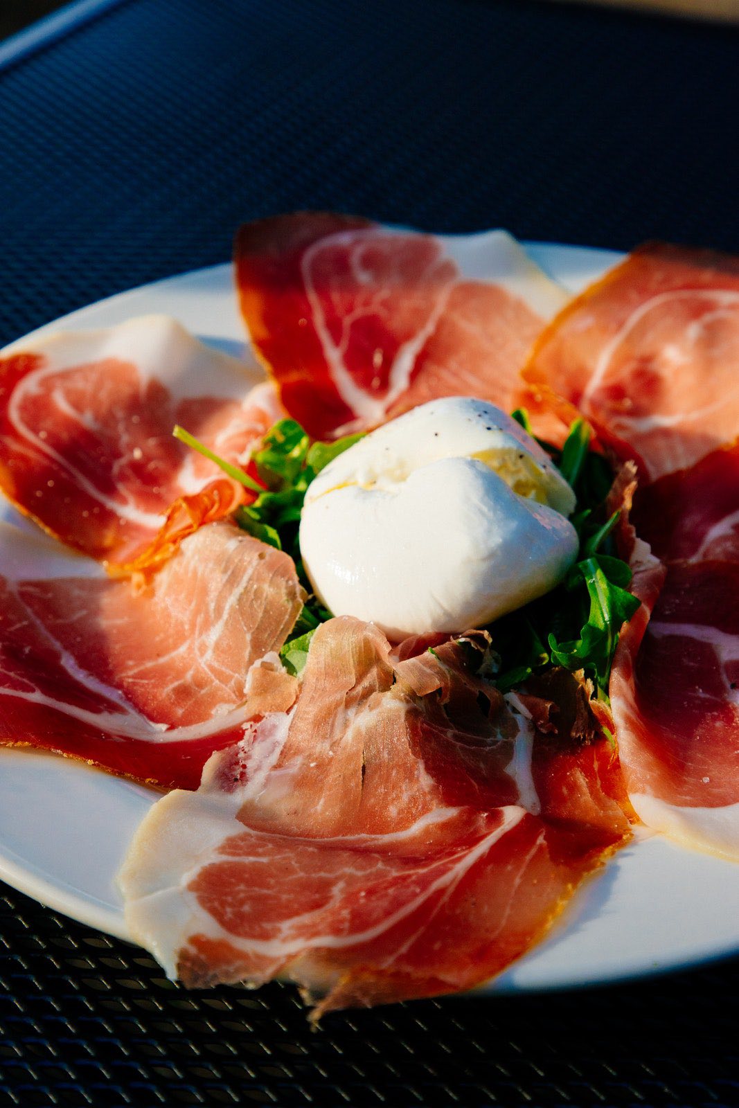 creamy, indulgent burrata cheese paired with salty, savory cured ham